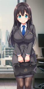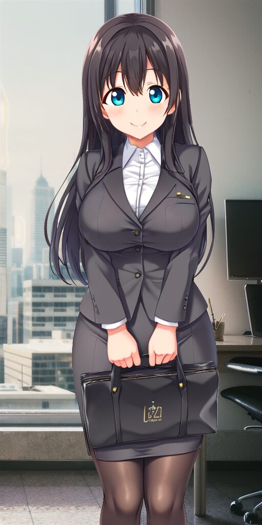 masterpiece,high quality,1 girl,((tareme)),curvy,large breasts,black long hair,extremely detailed face,smile,wearing suit,skirt,black pantyhose, holding black business bag,